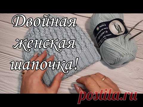Изображение показывает вязаную женскую шапку светло-голубого цвета и моток пряжи. На фоне видна надпись "Двойная женская шапочка!". Рядом с шапкой расположены руки, демонстрирующие изделие.