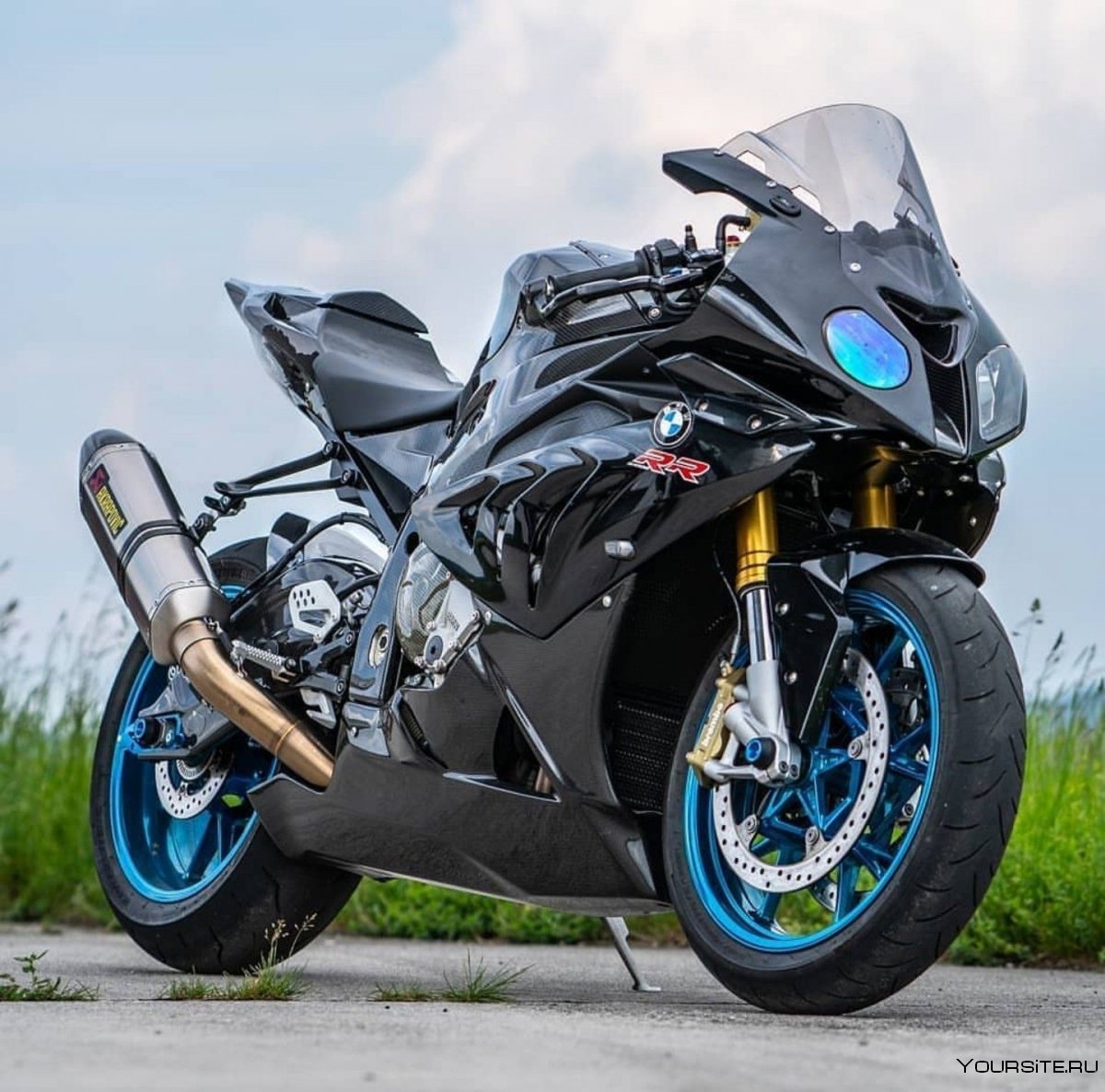 Спортивный мотоцикл с черным корпусом и синими акцентами, припаркованный на открытом пространстве.
