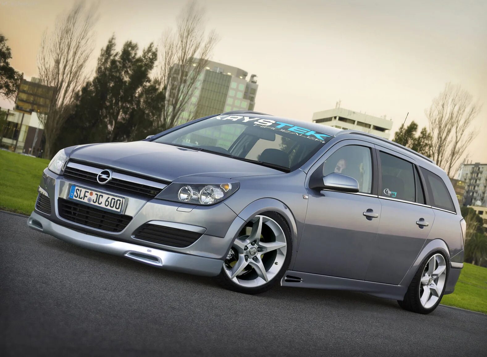 На изображении показан спортивный универсал автомобиля Opel в городском окружении. Машина имеет низкую посадку и стильные легкосплавные диски.