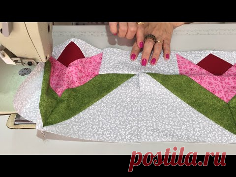 На изображении швейная машина, за которой женщина работает над лоскутным шитьём. Видно, как лоскуты ткани с цветочным узором пришиваются друг к другу.