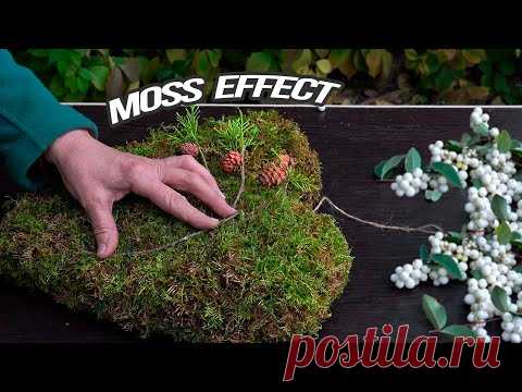 На изображении показана рука, касающаяся сердцевидной композиции из мха, украшенной шишками и растениями. Рядом расположены белые ягоды и зелёные листья. На фотографии также присутствует надпись "MOSS EFFECT".