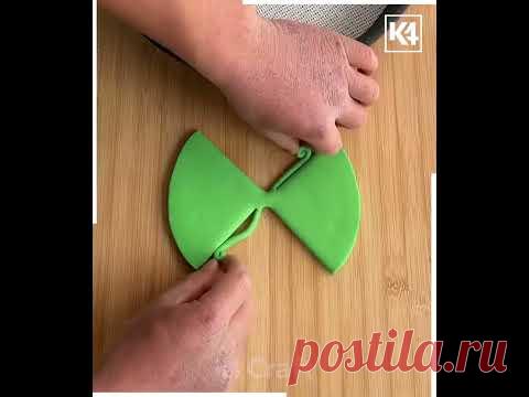 На изображении показаны человеческие руки, которые используют зеленый пластиковый инструмент для разделения чего-то. Зеленый объект имеет форму, напоминающую бабочку, и используется на деревянной поверхности.
