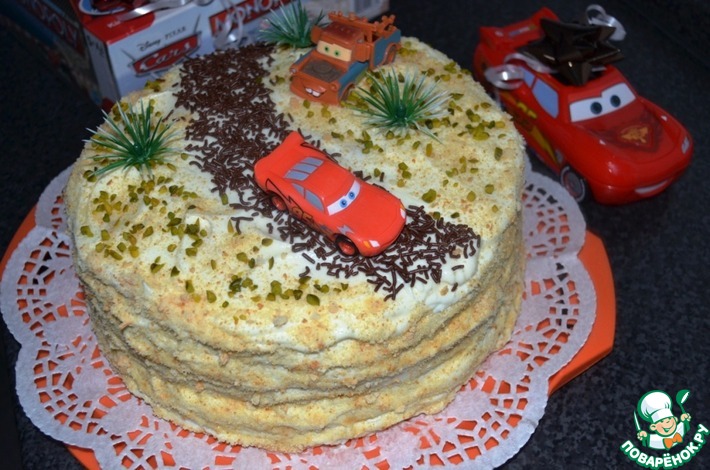 - Яйца, сахар, ванильный сахар, мёд хорошо взбить миксером. Добавить в яичную массу гащеную соду и растопить на водяной бане, примерно 15 минут. Масса должна увеличиться в объёме (надо постоянно помешивать). Добавить растоплённое, охлаждённое масло, перемешать. Снять с водяной бани, добавить муку и замесить не крутое тесто. Тесто разделить на 10 частей и убрать в пакет (накрыть полотенцем), чтобы оно не так быстро остыло. Брать по одной части и раскатывать лепёшку, 28 см. в диаметре. Чтобы не прилипало, присыпать мукой. Ложить одну лепёшку на другую, присыпая хорошо мукой. Раскатанную лепёшку положить на лист, проткнуть много раз вилкой и выпекать в духовке при 180 градусах, до золотистого цвета. Пекутся очень быстро! Вот такая горка получается! Дать коржам хорошо остыть, (около 3 часов)! Теперь сделать крем! Взбивая сливки постепенно добавить сахар, сгущённое молоко и загуститель для сливок. Взбить до крепкого крема, но не до масла. Крем должен быть однородной массой! Каждый корж промазать хорошо кремом, не жалеть! Верх и бока торта, тоже смазать хорошо кремом. Я попыталась сделать с помощью ложки дорогу для машин и ямки. Печенье положить в пакет и размельчить с помощью скалки, посыпать крошкой торт. Украсить по желанию! Дать пропитаться при комнатной температуре часа 2, потом поставить на холод, лучше на всю ночь! Торт в готовом состоянии! Приятного аппетита!