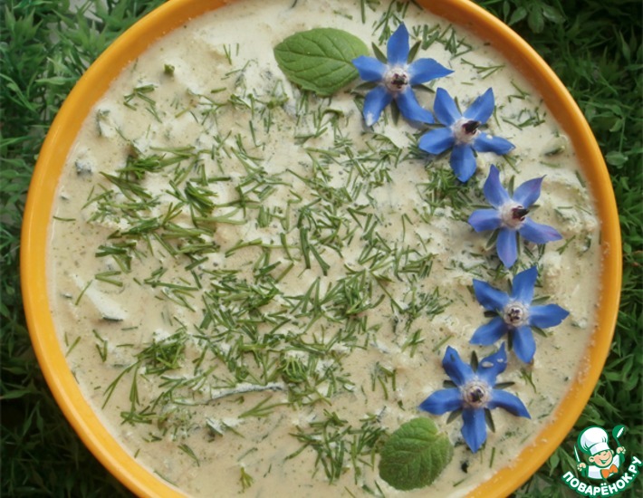 - Грецкие орехи перебрать, удалить возможный мусор, крошки скорлупы или перегородок, промыть и замочить в чистой холодной фильтрованной воде на 10-12 часов (удобно – на ночь). Этот важный шаг не только поможет удалить часть вредных веществ, неизбежно скопившихся в орехах, но и значительно улучшит их вкус. Затем орехи тщательно промыть под проточной холодной водой. Огурцы промыть, осушить от лишней влаги. (Для этого блюда хорошо подойдут даже переросшие, большие, "незамеченные ранее" огурцы, что особенно важно для счастливых обладателей собственных парников и теплиц.) Натереть огурцы на терке для корейской моркови с использованием насадки для средней шинковки. Добавить соевый соус и перемешать. Оставить на 5-10 минут, пока будем готовить ореховую заправку. За это время выделится нужный рассол для соуса. Подготовленные орехи (замоченные и промытые) поместить в блендер (подойдет любой, мощностью от 600 Вт - и комбинированный с S-образными ножами, и погружной, и стационарный). Добавить порезанный укроп, порезанные листья мяты, чеснок, лимонный сок, острый перец и выделившийся рассол от огурцов. Промолоть до максимально однородной консистенции. Тщательно перемешать ореховый соус и натертые огурцы. Важный момент (!). Если Вы уже привыкли к большому количеству зелени в рационе, добавьте в соус укроп и мяту в количестве до 100 грамм (а это о-о-очень большой пучок) – тогда соус получится даже более зеленым, чем на этом фото (здесь 50г. укропа и 10г. мяты). Если же Вы еще не привыкли к большому количеству сырой клетчатки в меню, мелко нарежьте приемлемое количество укропа и мяты к огурцам и добавьте чуть-чуть в соус. Тогда огуречно-ореховый дип будет белее (как на следующих фото) Отправить соус в холодильник на 10-15 минут для охлаждения и "дружбы" ингредиентов (так правда вкуснее). Затем перемешать, попробовать, выправить вкус (добавить соли, если не хватит солености соевого соуса, натертую цедру, если не хватит лимонного аромата, перчика чили, если не будет доставать остроты...) Украсить зеленью и/или съедобными цветами (на фото - бораго/огуречная трава) и подавать порционно или в общей чаше.