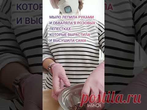 Человек в маске и перчатках работает с мылом и сушеными лепестками в чаше. На заднем фоне текст о процессе изготовления мыла.