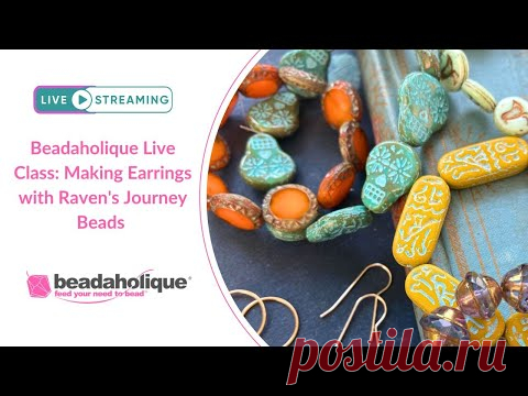 Изображение рекламирует онлайн-класс по изготовлению сережек с использованием бусин Raven"s Journey от Beadaholique. На фото показаны цветные бусины и крючки для сережек.