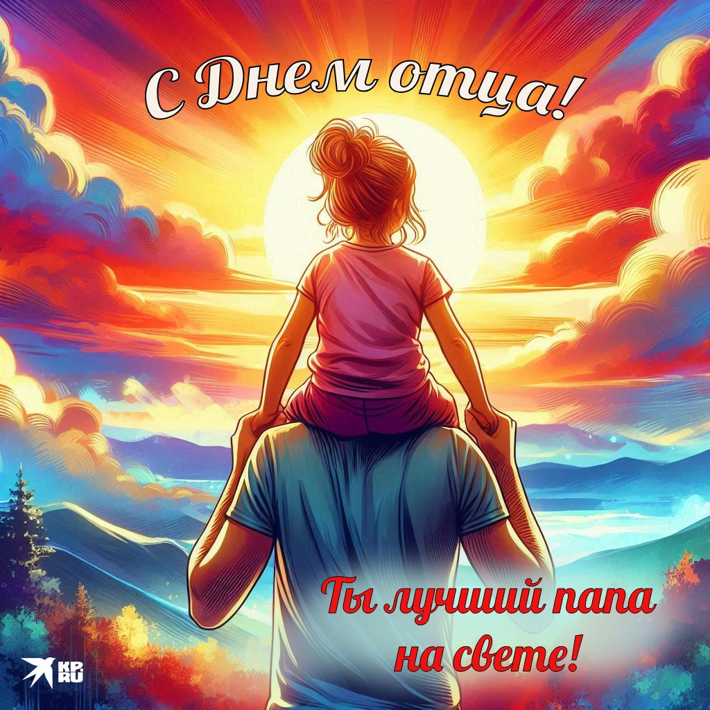 Живописное изображение заката с отцом, который несет своего ребенка на плечах. На изображении написано "С Днем отца!" и "Ты лучший папа на свете!".