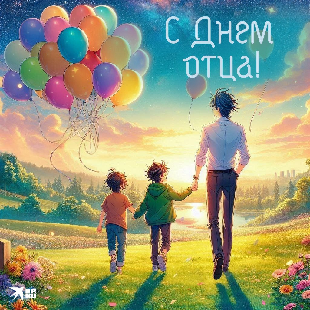 На изображении аниме-персонажи: отец и двое детей держатся за руки и идут по зеленому полю. В небе много цветных воздушных шаров. В верхней части надпись "С Днем отца!".
