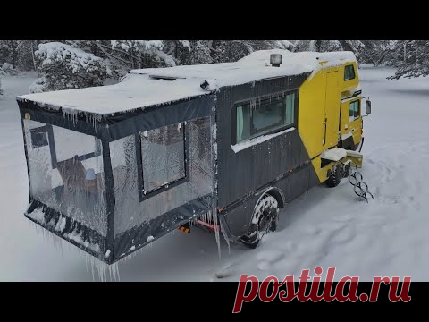 КЕМПИНГ С ГРУЗОВИКОМ-КАРАВАНОМ С ПЕЧЬЮ В СИЛЬНОМ СНЕГЕ
