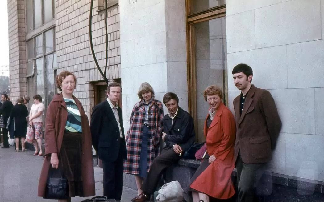 На изображении группа людей стоит и сидит около здания из кирпича. Некоторые из них одеты в пальто.