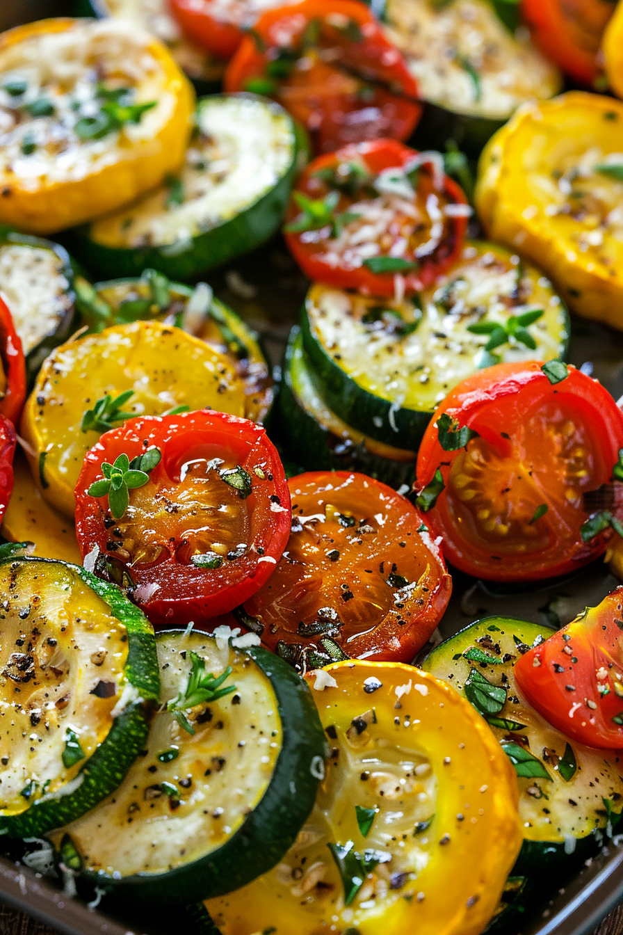 Roasted Garlic-Parmesan Zucchini, Squash and Tomatoes Savor the perfect blend of summer flavors with this Roasted Garlic-Parmesan Zucchini, Squash, and Tomatoes recipe. Featuring garden-fresh zucchini, yellow squash, and juicy tomatoes seasoned with garlic, Italian herbs, and a generous sprinkle of Parmesan cheese, this dish is a delightful, easy-to-make side for any meal.