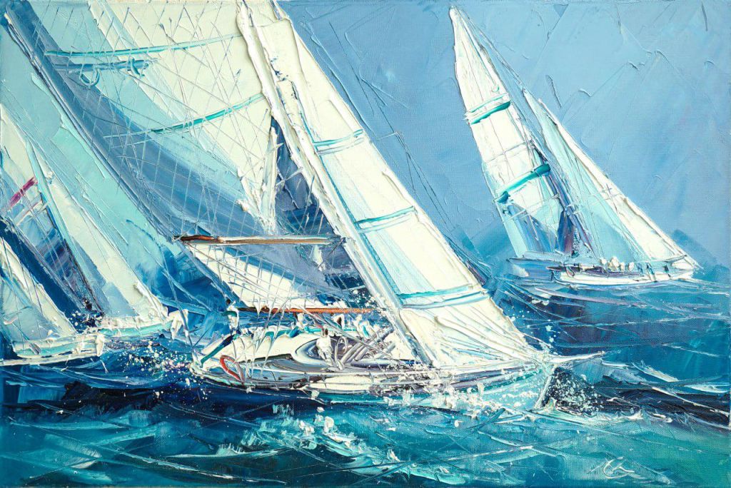 Картина с изображением нескольких парусников, плывущих по морю. Яркие цвета и динамичные мазки создают ощущение движения.
