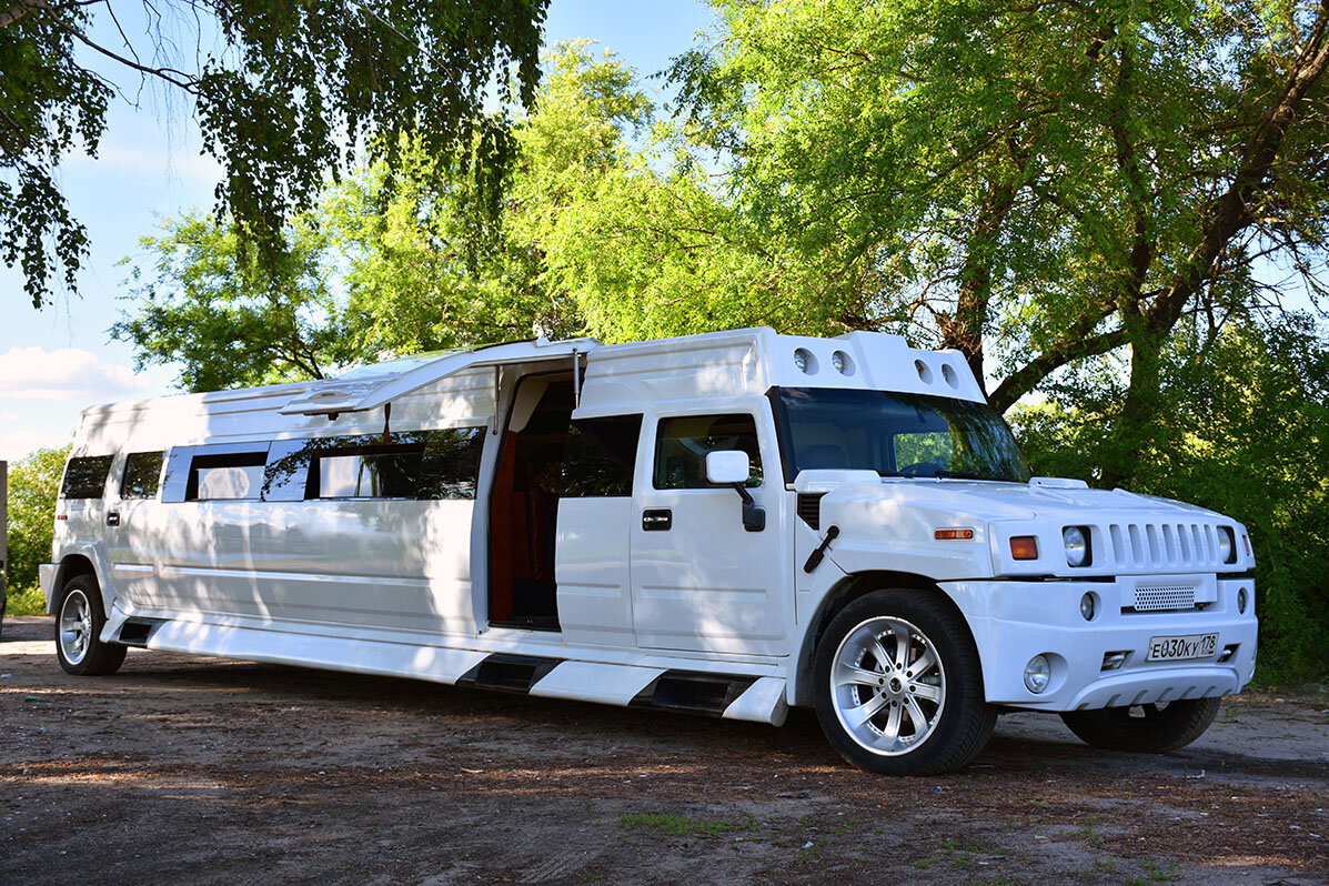 На изображении белый лимузин Hummer припаркован на улице под деревьями.