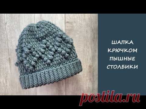 Вязанная крючком шапка из объемных столбиков серого цвета, лежащая на деревянной поверхности. Рядом текст на русском языке: "Шапка крючком пышные столбики".