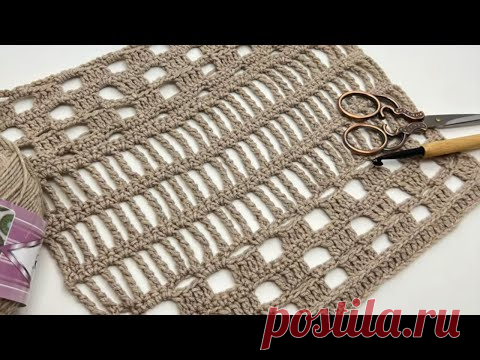 На изображении представлен вязаный образец из бежевой пряжи с открытыми петлями и орнаментом. Рядом с образцом лежат ножницы и крючок для вязания.