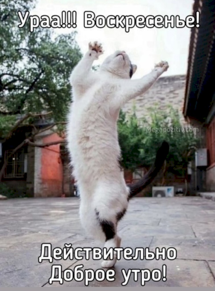 Изображение с кошкой, подпрыгивающей на задних лапах, с текстом: "Ураа!!! Воскресенье! Действительно Доброе утро!"