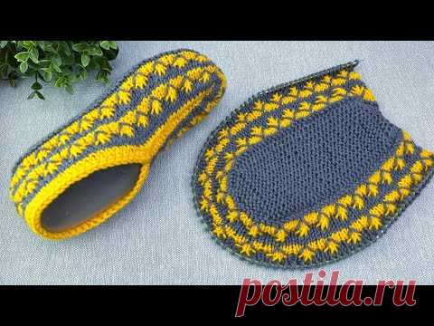 Изображение двух вязанных тапочек, один из которых собран, а другой - в виде выкройки. Цвета: серый и жёлтый. На фоне - растение.