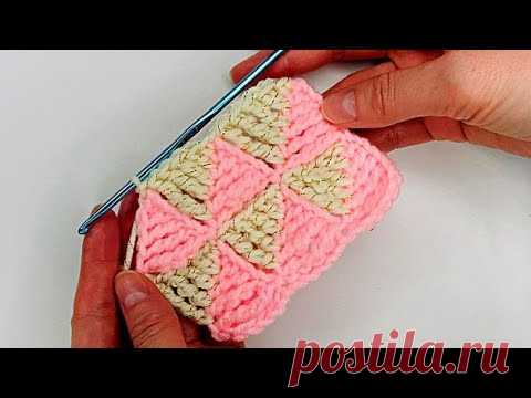 Изображение показывает процесс вязания крючком: узор выполнен в розовых и кремовых треугольниках.