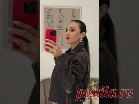 Женщина делает селфи в зеркале, держа в руках красный смартфон. На ней кожаная куртка и серьги, волосы собраны. На заднем плане картина с абстрактными линиями и кресло.