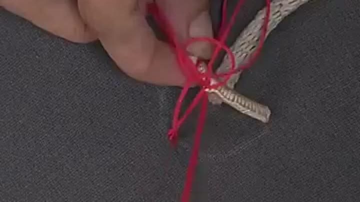 Изображение показывает руку, завязывающую красную нить вокруг плетеной веревки на сером фоне.