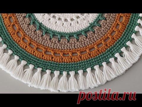 Круглое вязание с разноцветными полосами и кисточками по краям.