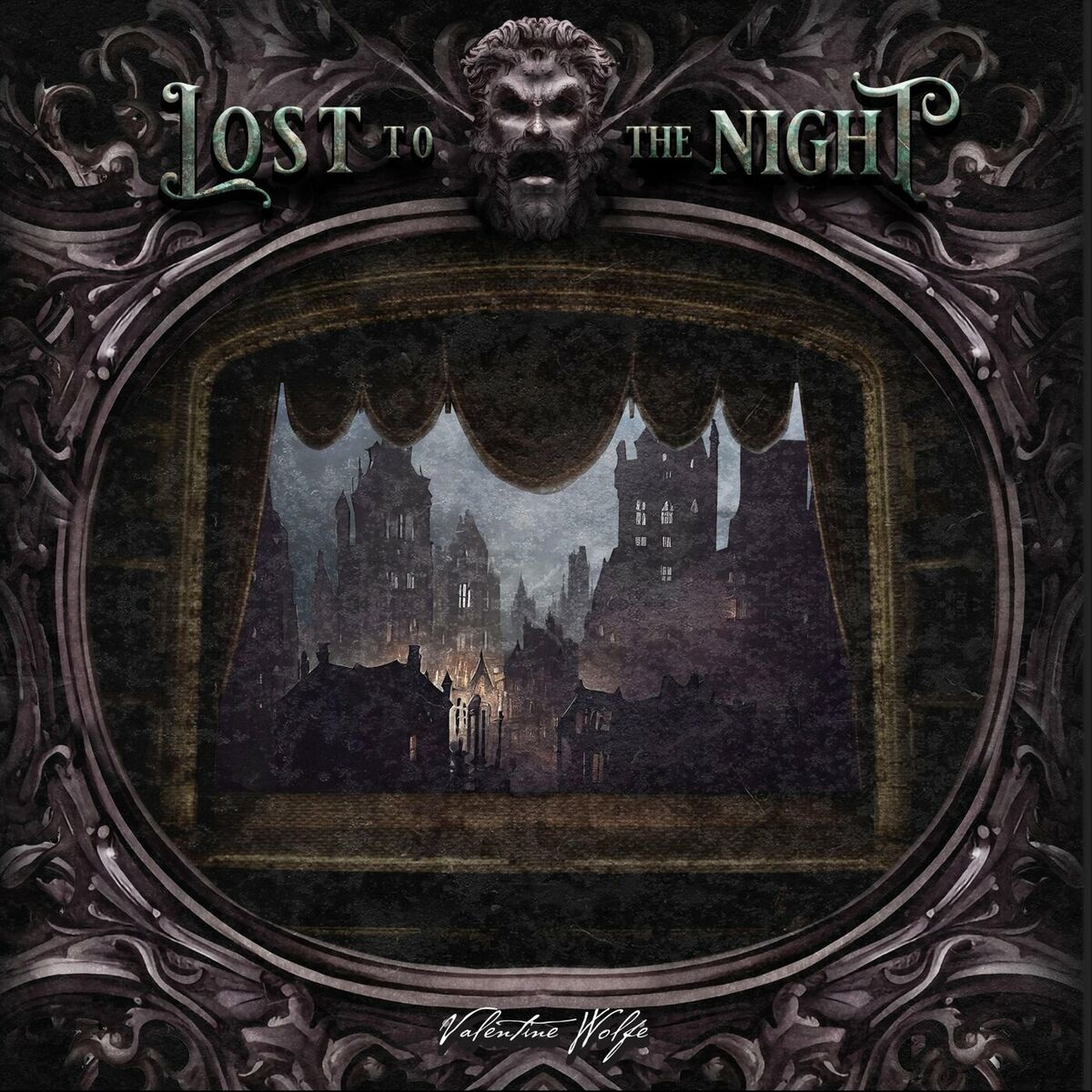 Изображение в готическом стиле с темной сценой, показывающей мрачный город на фоне ночного неба. Наверху видна надпись "Lost to the Night", окруженная декоративной рамкой с грозным лицом.
