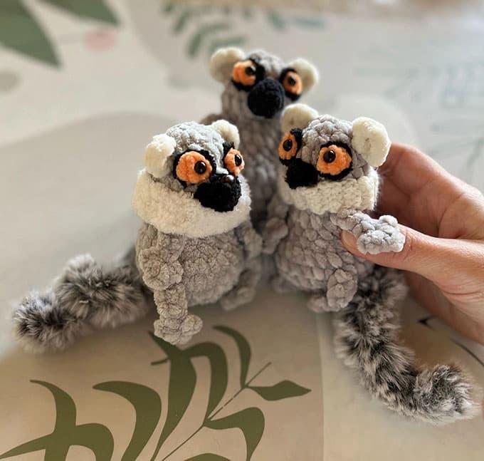 Изображение показывает три маленькие вязанные игрушки, напоминающие лемуров, с большими оранжевыми глазами и пушистыми хвостами. Они сделаны из серой пряжи, и одна из игрушек держится рукой.