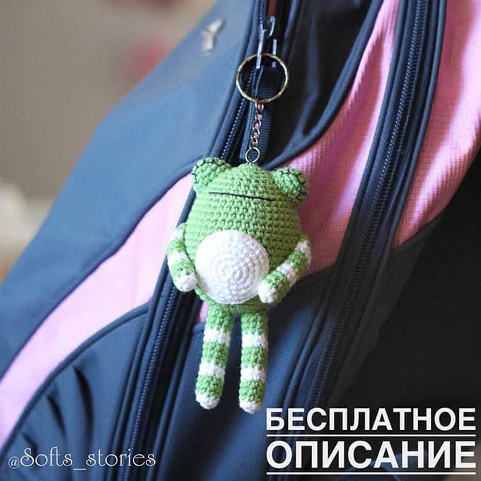 Изображение показывает зеленый вязаный брелок в виде лягушки, прикрепленный к рюкзаку.