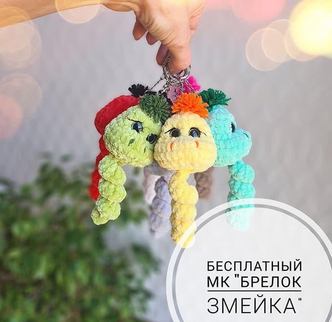 На изображении три разноцветных вязаных брелка в форме змей, которые держат в руке. Внизу надпись на русском языке, которая гласит: "Бесплатный МК брелок змея".