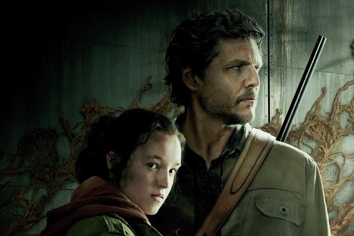 На изображении находятся два человека. Один мужчина держит ружьё и серьёзно смотрит вперед. Рядом с ним стоит молодая девушка, прижимающаяся к мужчине, они выглядят обеспокоенными.