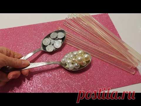 На изображении руки держат две ложки, в одной из которых находятся блестящие монеты, а в другой — жемчужины. На заднем плане находится розовый блестящий лист и прозрачные клеевые стержни.