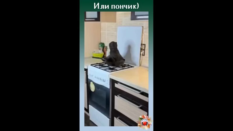 На изображении ламантин сидит на кухонной плите в домашней обстановке. Кухня выглядит уютно, на заднем плане видна зелёная кастрюля.