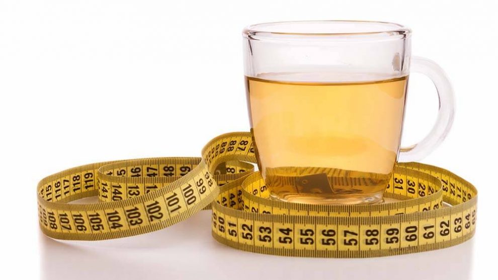 На изображении стеклянная чашка с чаем и вокруг неё расположена жёлтая измерительная лента.