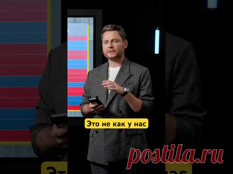 На изображении человек в сером костюме, держащий смартфон, на фоне цветного графика. Субтитры внизу гласят: "Это не как у нас".