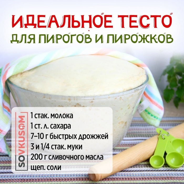 На изображении показан рецепт идеального теста для пирогов и пирожков. Ингредиенты: 1 стакан молока, 1 ст. л. сахара, 7-10 г быстрых дрожжей, 3 и 1/4 стакана муки, 200 г сливочного масла, щепотка соли.