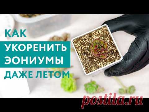 Изображение демонстрирует, как укоренить эониум в горшке с землей. На переднем плане рука в перчатке держит горшок с растением.