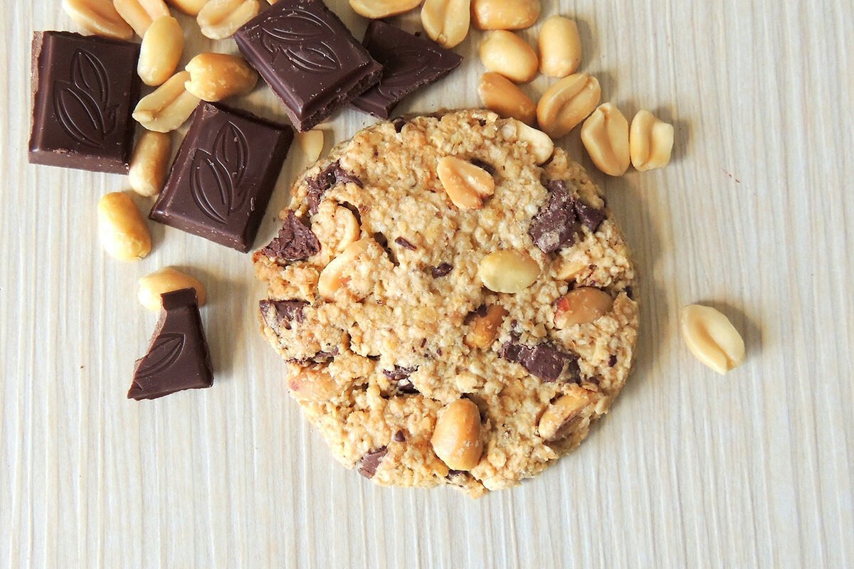 Изображение овсяного печенья с кусочками шоколада и орехами на столе.