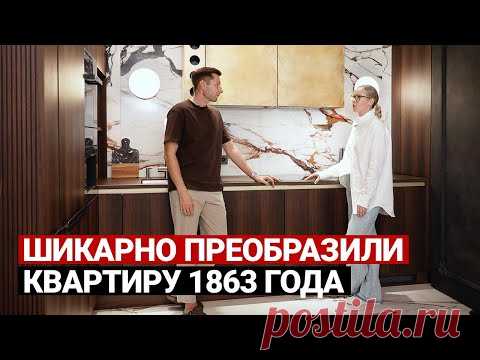 Двое людей обсуждают кухню с современным интерьером. На переднем плане крупный текст на русском языке: "Шикарно преобразили квартиру 1863 года".