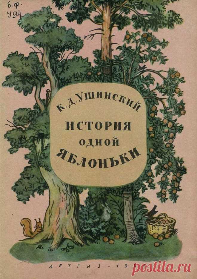 Обложка книги К.Д. Ушинского "История одной яблоньки". На изображении деревья и лесные животные.
