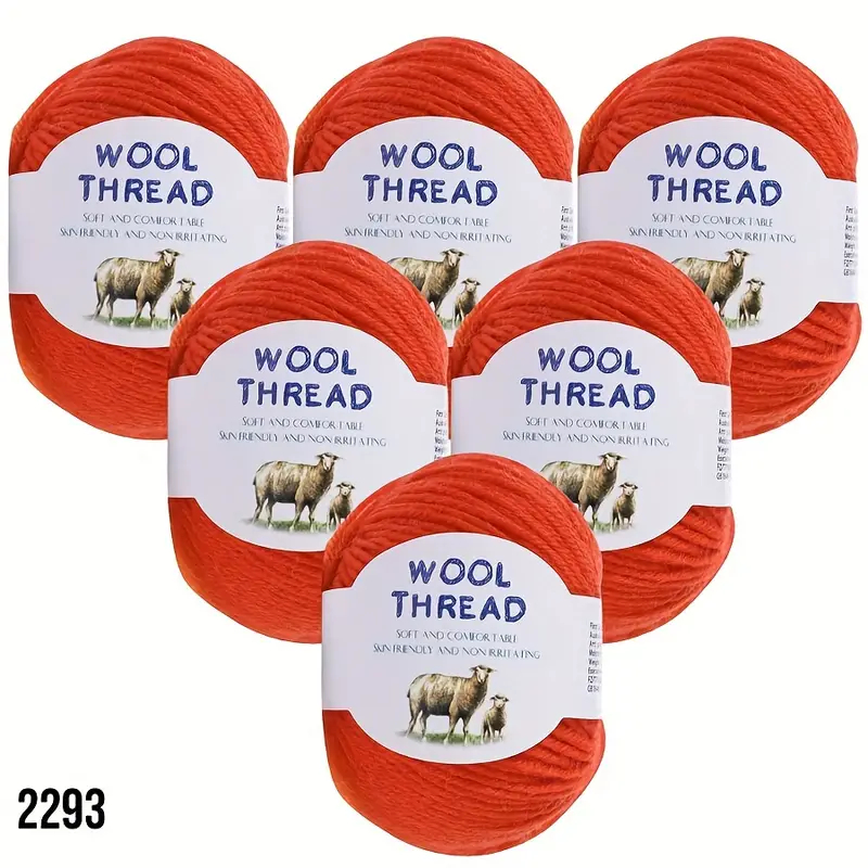 На изображении изображены мотки шерстяной пряжи ярко-оранжевого цвета с этикеткой "WOOL THREAD".
