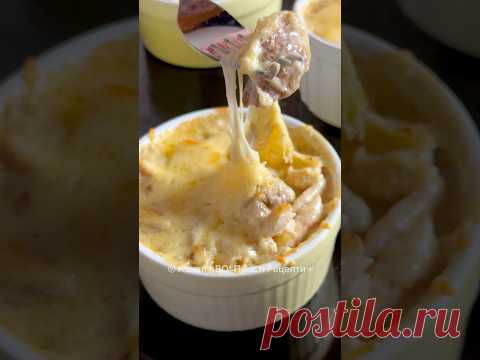 На изображении жульен в креманке. Из блюда тянется расплавленный сыр.
