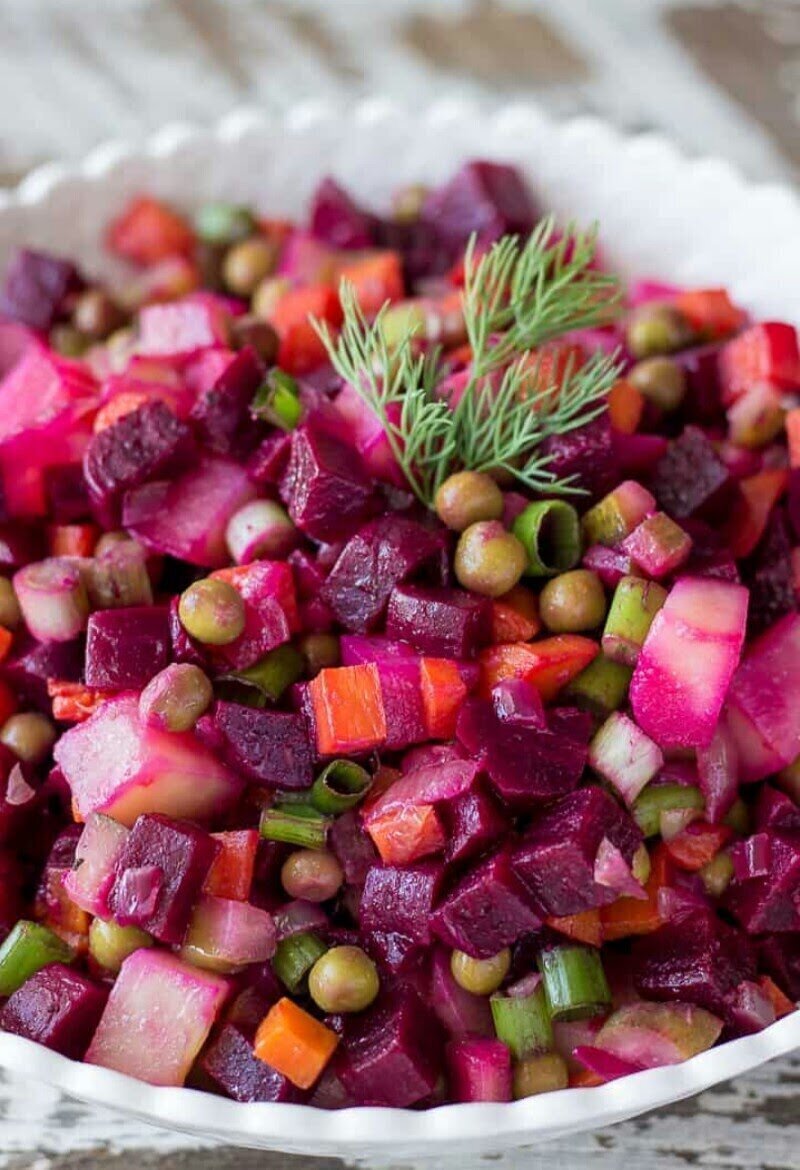 На изображении традиционный русский салат Винегрет, состоящий из свеклы, картофеля, моркови, лука, зелёного горошка и украшенный укропом.