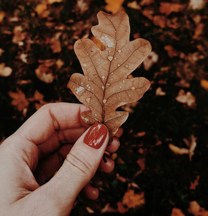 Человек держит в руке сухой осенний лист с каплями воды на фоне опавших листьев.