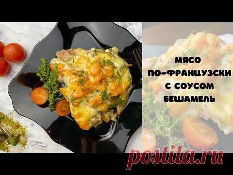 Изображение блюда под названием "Мясо по-французски с соусом бешамель". Оно выглядит аппетитно, на черной тарелке с овощами и зеленью.