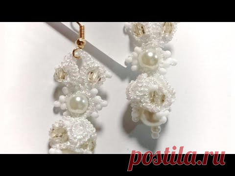 Изображение пары серьг с белыми бусинами и блестящими элементами.