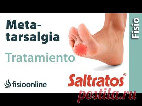 Изображение показывает стопу с выделенным участком, обозначающим боль в пятке, с текстом, касающимся лечения метатарзалгии и рекламой продукта Saltratos.