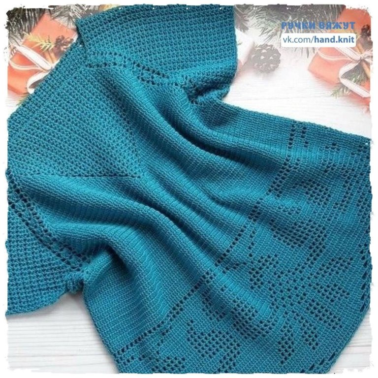 Изображение показывает вязаное изделие, возможно свитер или платье, бирюзового цвета, расположенное на белой поверхности. На заднем плане видны небольшие элементы декора.