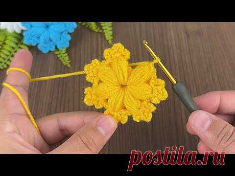 Изображение показывает процесс вязания крючком желтого цветка. Руки держат вязание и крючок для вязания. На заднем плане видны другие связанные цветы и зелёные листья.