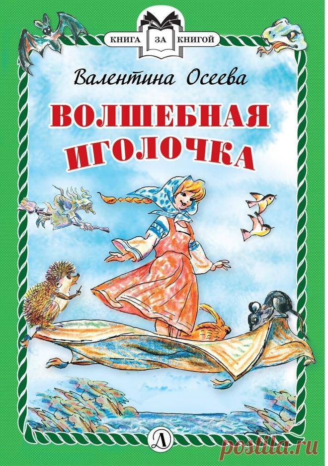 Обложка книги "Волшебная иголочка" Валентины Осеевой. На рисунке изображена девочка в платке и сарафане, стоящая на волшебном ковре, с рядом присутствующими животными и птицами.