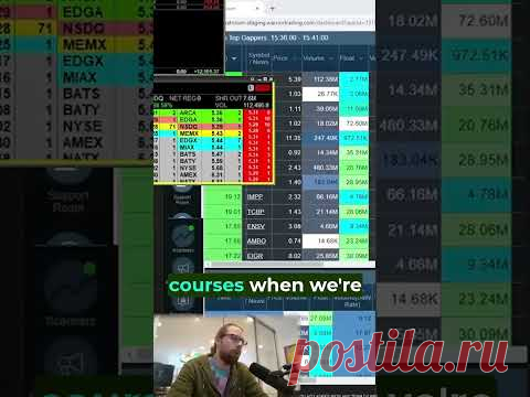 Изображение экрана с таблицей данных о торговле акциями и человеком, сидящим перед компьютером и микрофоном.